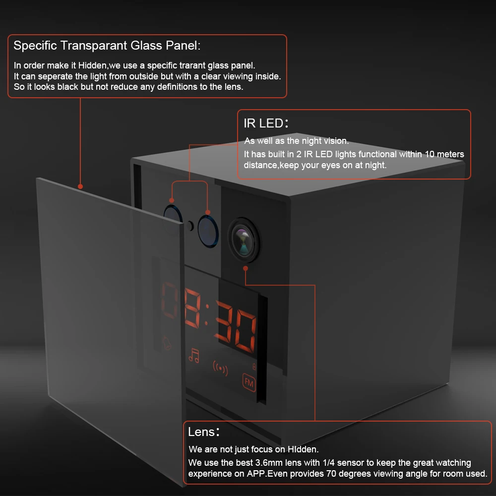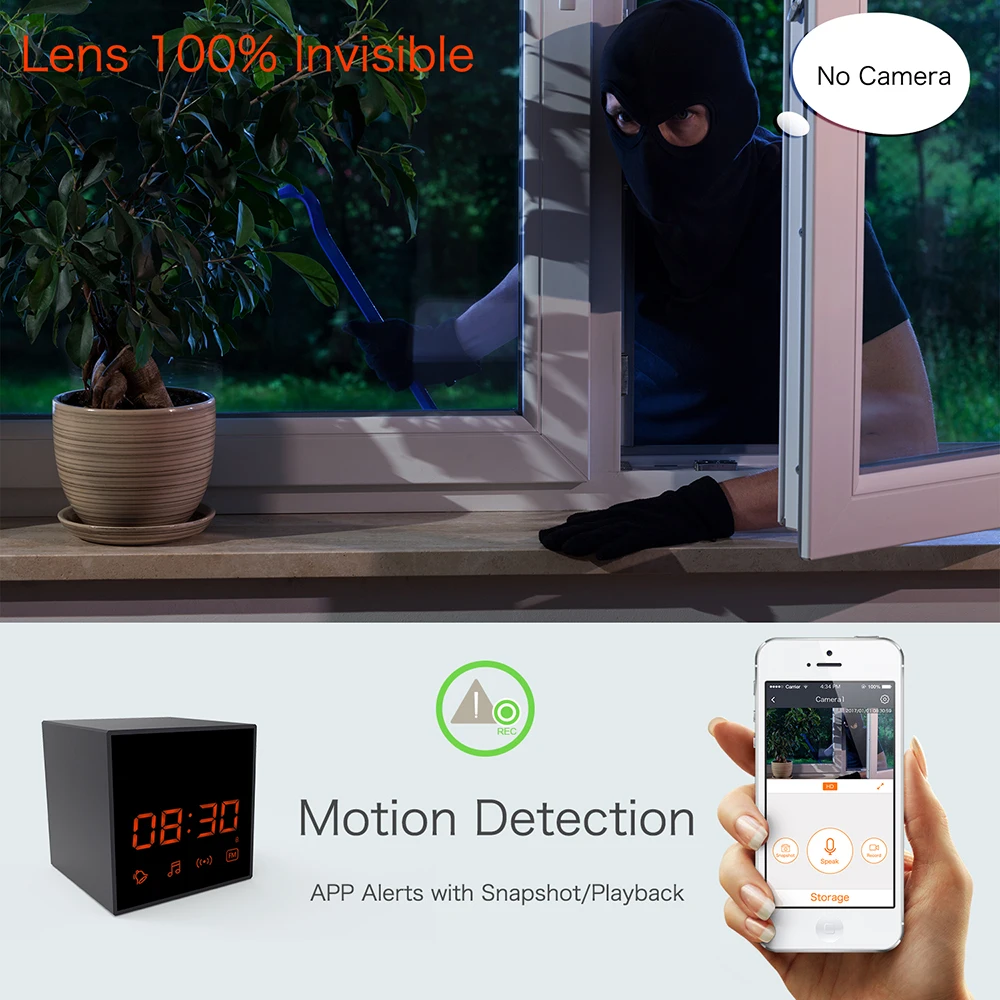 8. Support Motion detection and alarm, push notifications to APP. Email Alerts with photo. Motion detection recording.